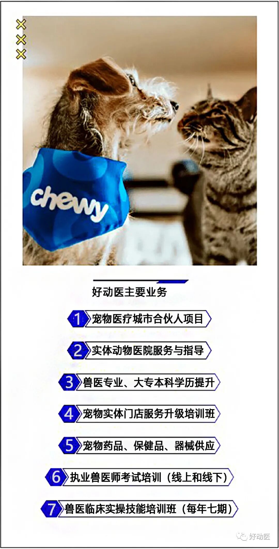 好动医是国内领先的VCT(兽医临床技术)培训和动物医院建设综合服务商,我们从实际出发,围绕宠物医疗供应链,致力于为用户提供更多个性化、定制化宠物医疗服务。在保障动物福利基础上,不断完善动物医院服务和管理体系,为构建人类与动物和谐新世界而持续努力。目前好动医培育优秀兽医人才2700余人,孵化动物医院300余家,业务遍及90多个城市和地区。